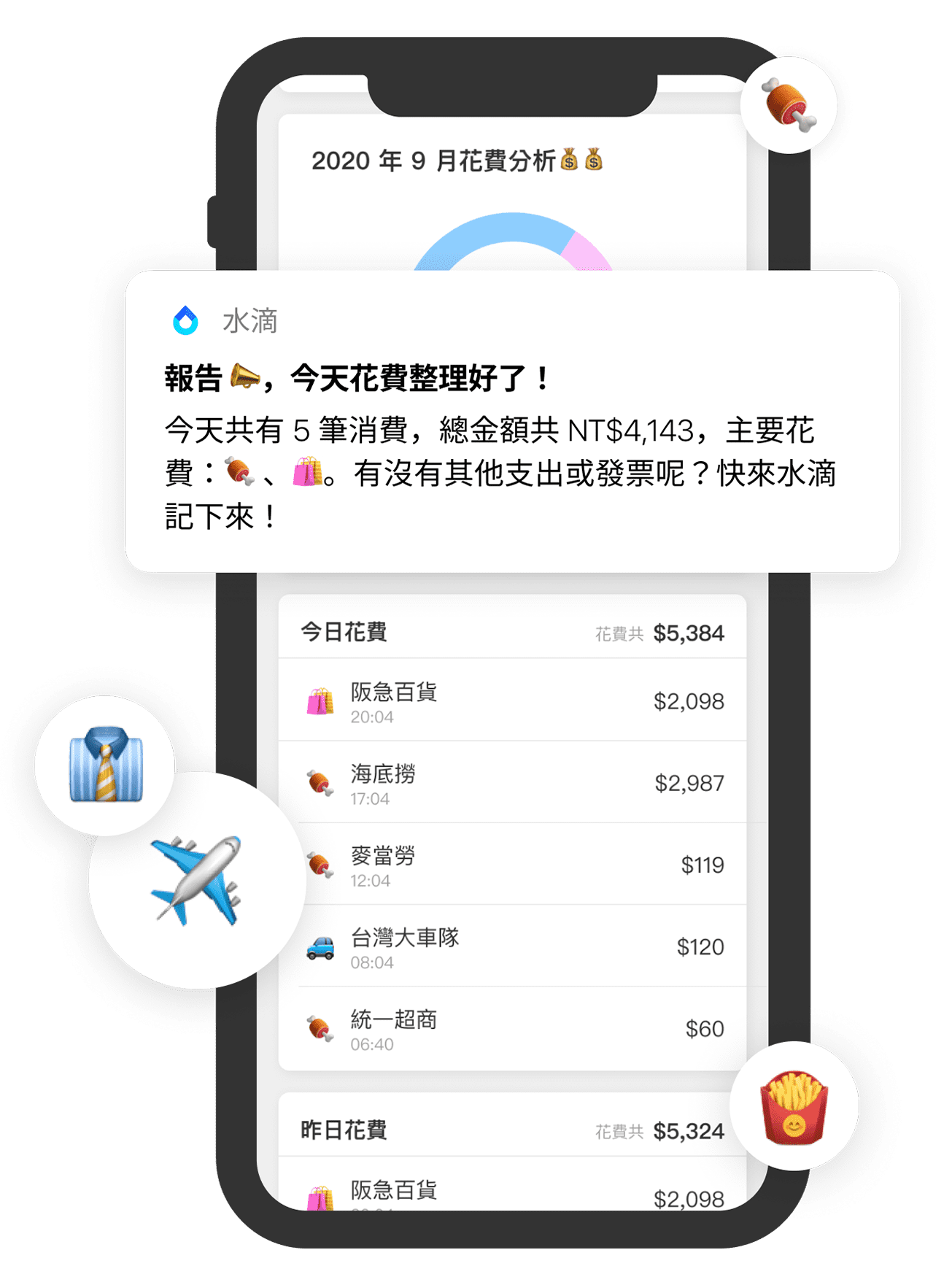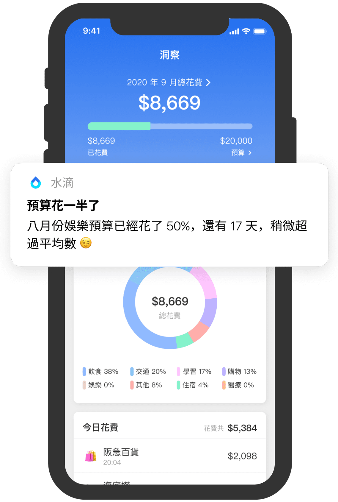 透過 AI 分析技術,⽔滴為你設定最適合你的花費規劃,並在適當的時機提醒你。不知不覺中,存下⼀張台積電。